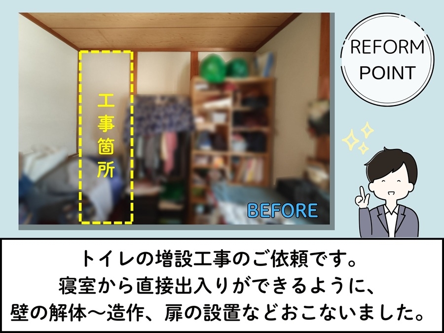 寝室と廊下の間の壁を解体し、トイレスペースとして